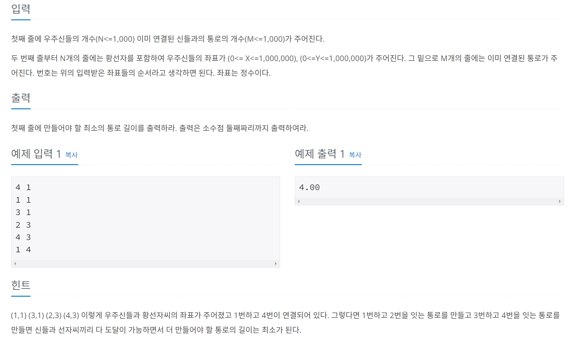 (1,1) (3,1) (2,3) (4,3) 이렇게 우주신들과 황선자씨의 좌표가 주어졌고 1번하고 4번이 연결되어 있다. 그렇다면 1번하고 2번을 잇는 통로를 만들고 3번하고 4번을 잇는 통로를 만들면 신들과 선자씨끼