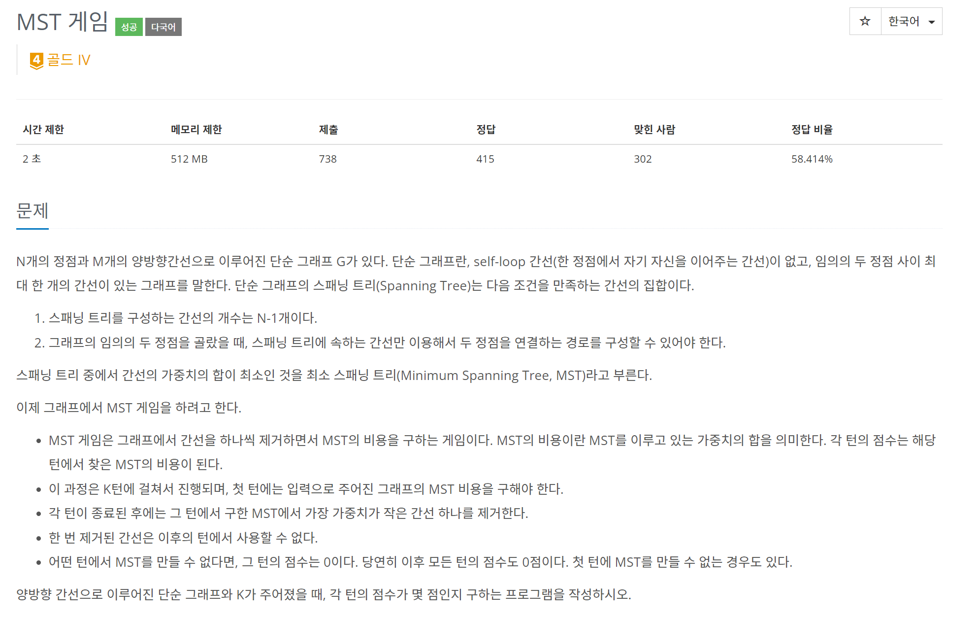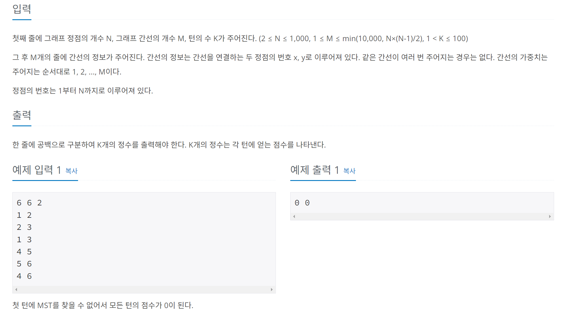 기존 MST문제들은 무조건 MST를 만들어야해서 편하게 크루스칼을 사용하면 되지만, 이 문제는 MST가 만들어지지 않을 수도 있어서 MST인지 판단해야 하는 로직이 어려웠습니다.