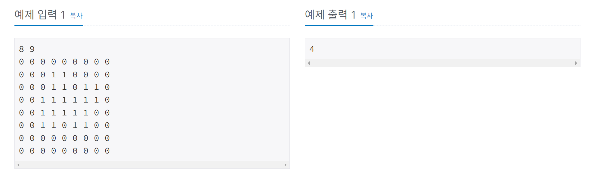 첫째 줄에는 모눈종이의 크기를 나타내는 두 개의 정수 N, M (5 ≤ N, M ≤ 100)이 주어진다. 그 다음 N개의 줄에는 모눈종이 위의 격자에 치즈가 있는 부분은 1로 표시되고, 치즈가 없는 부분은 0으로