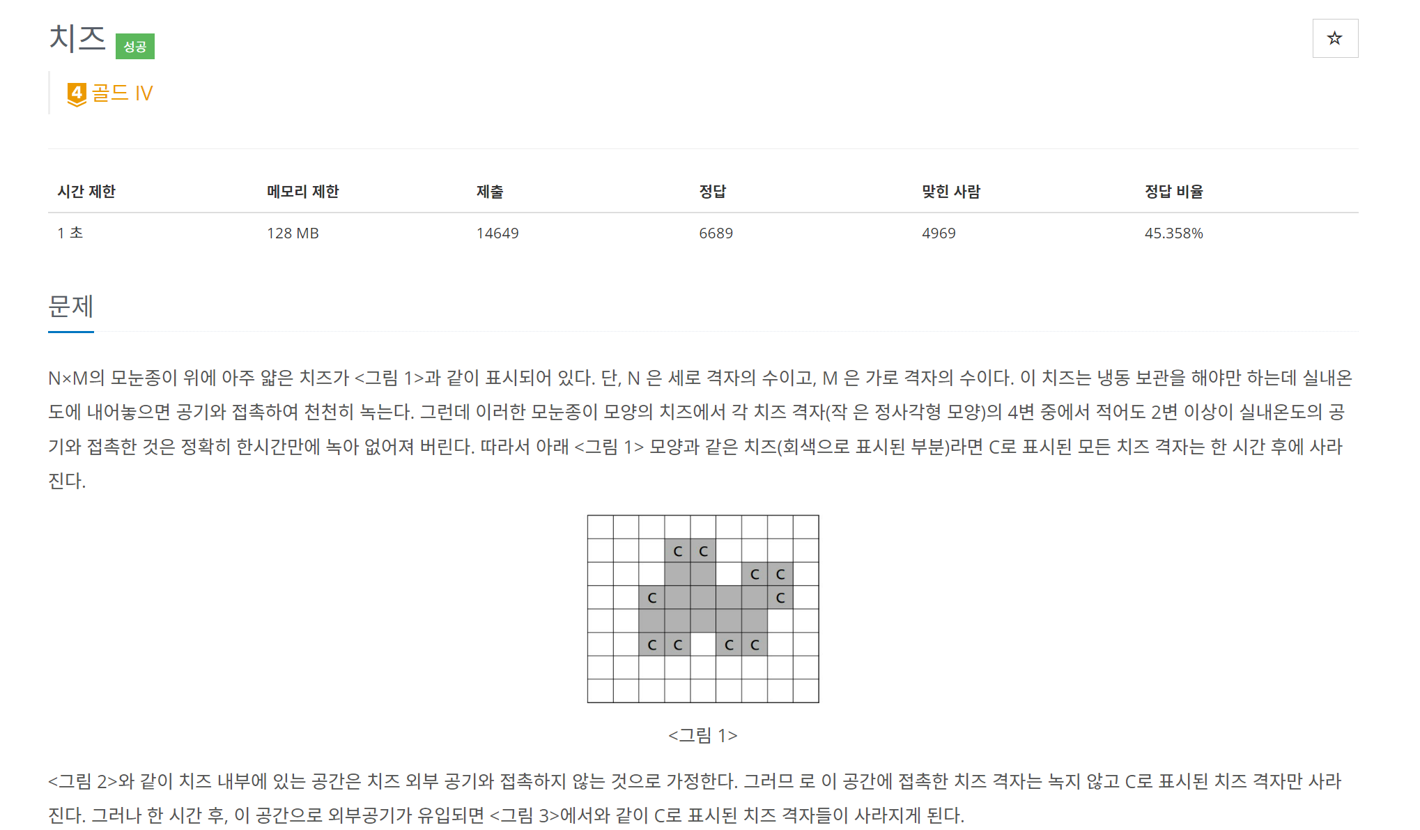출처 : https://www.acmicpc.net/problem/2636 2636번: 치즈 첫째 줄에는 사각형 모양 판의 세로와 가로의 길이가 양의 정수로 주어진다. 세로와 가로의 길이는 최대 100이다. 판의 각 가로줄의 모양이 윗 줄부