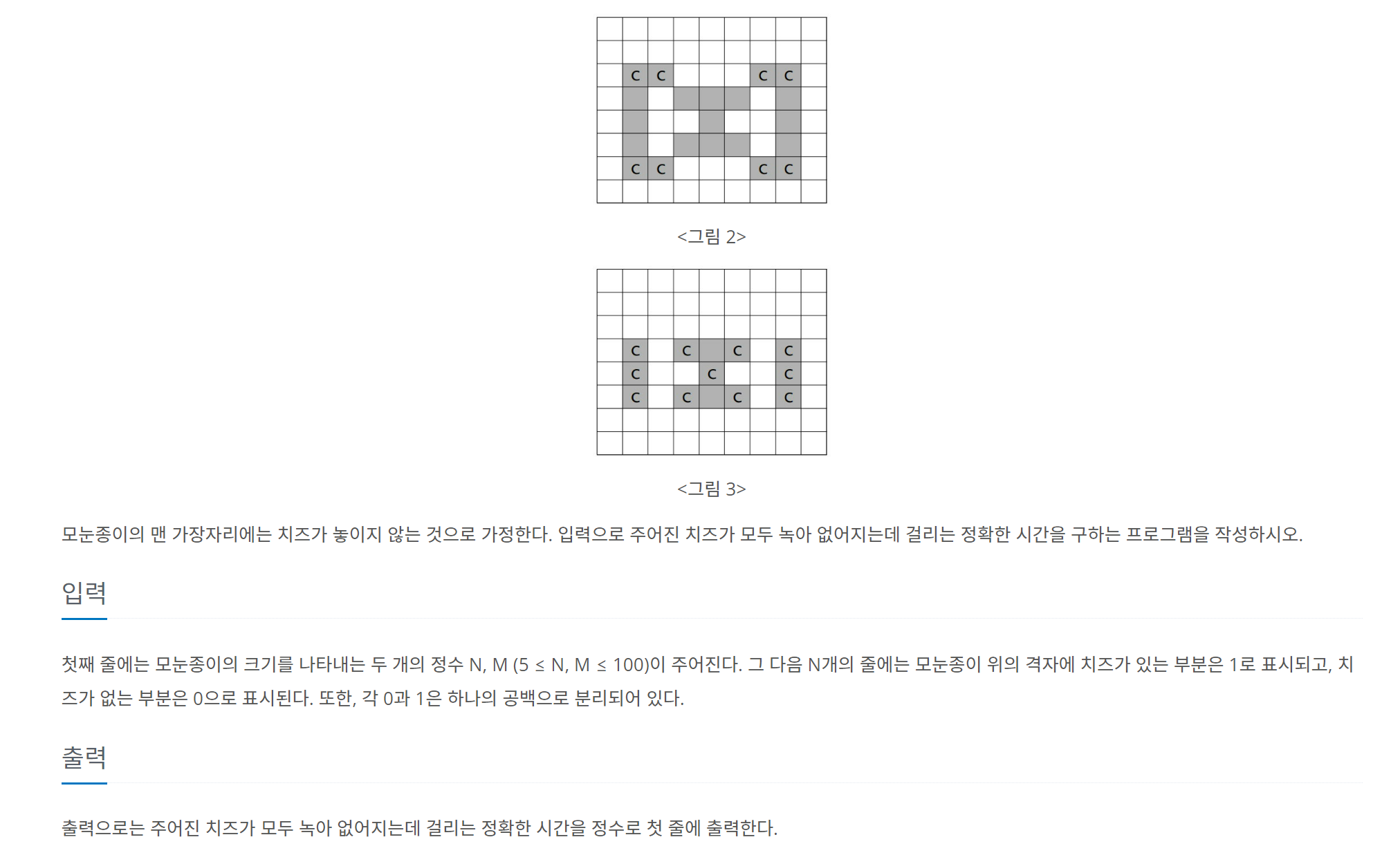 모눈종이의 맨 가장자리에는 치즈가 놓이지 않는다고 했으므로, (0,0) 또는 다른 테두리 지점에서부터 bfs를 탐색할 수 있습니다.