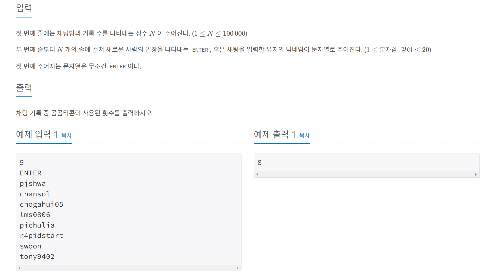 단, 한가지 주의할 점은 ENTER(새로운 사람이 채팅방에 입장)가 입력되었을 때 다시 곰곰티콘으로 인사를 하는 구조이므로, ENTER입력이 들어오면 현재까지 HashSet의 크기를 count에 더해주고 HashSet을 clear 해줍니다.