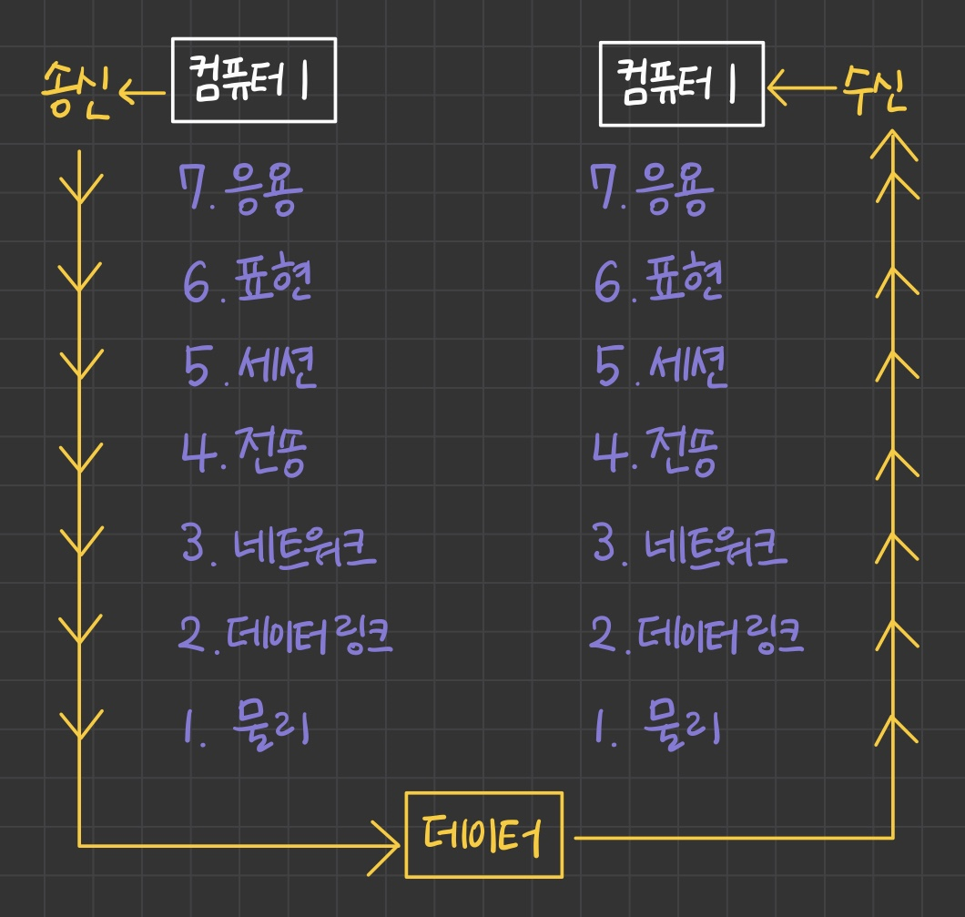 송신 측에서 7계층부터 1계층까지 거친 뒤, 수신하는 쪽에서 1계층부터 다시 7계층을 거쳐 데이터가 전송됩니다.