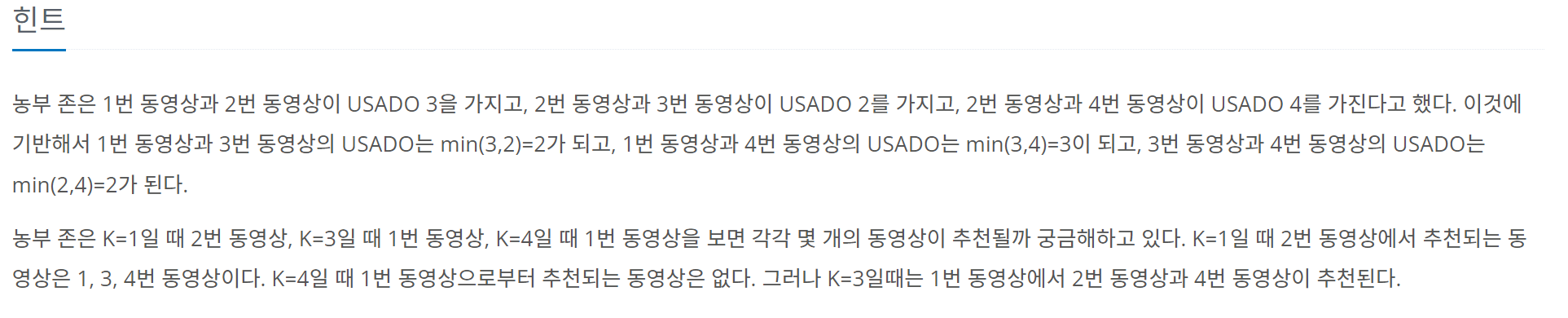 농부 존은 1번 동영상과 2번 동영상이 USADO 3을 가지고, 2번 동영상과 3번 동영상이 USADO 2를 가지고, 2번 동영상과 4번 동영상이 USADO 4를 가진다고 했다. 이것에 기반해서 1번 동영상과 3번 동영상의
