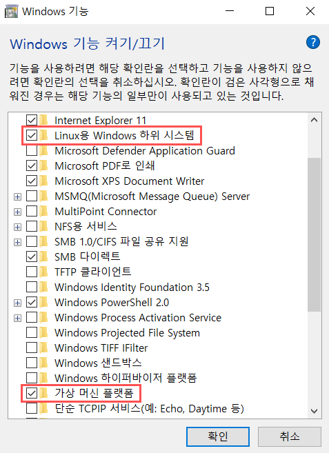 - [Linux용 Windows 하위시스템] 과 [가상 머신 플랫폼] 기능을 체크한 뒤 확인버튼 클릭