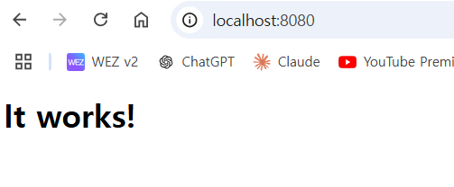 명령어 실행 후 http://localhost:8080/ 에 접속해보면 아파치가 띄워졌는지 확인할 수 있다.
