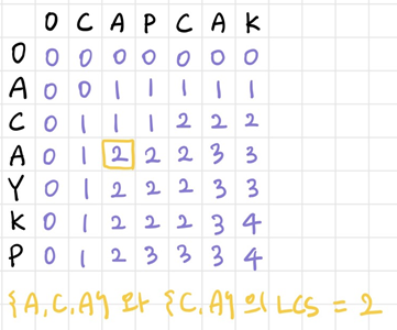 그림의 노란색으로 표시된 곳을 해석해보면, {A, C, A} 집합과 {C, A}집합의 LCS가 2라는 것을 의미합니다.