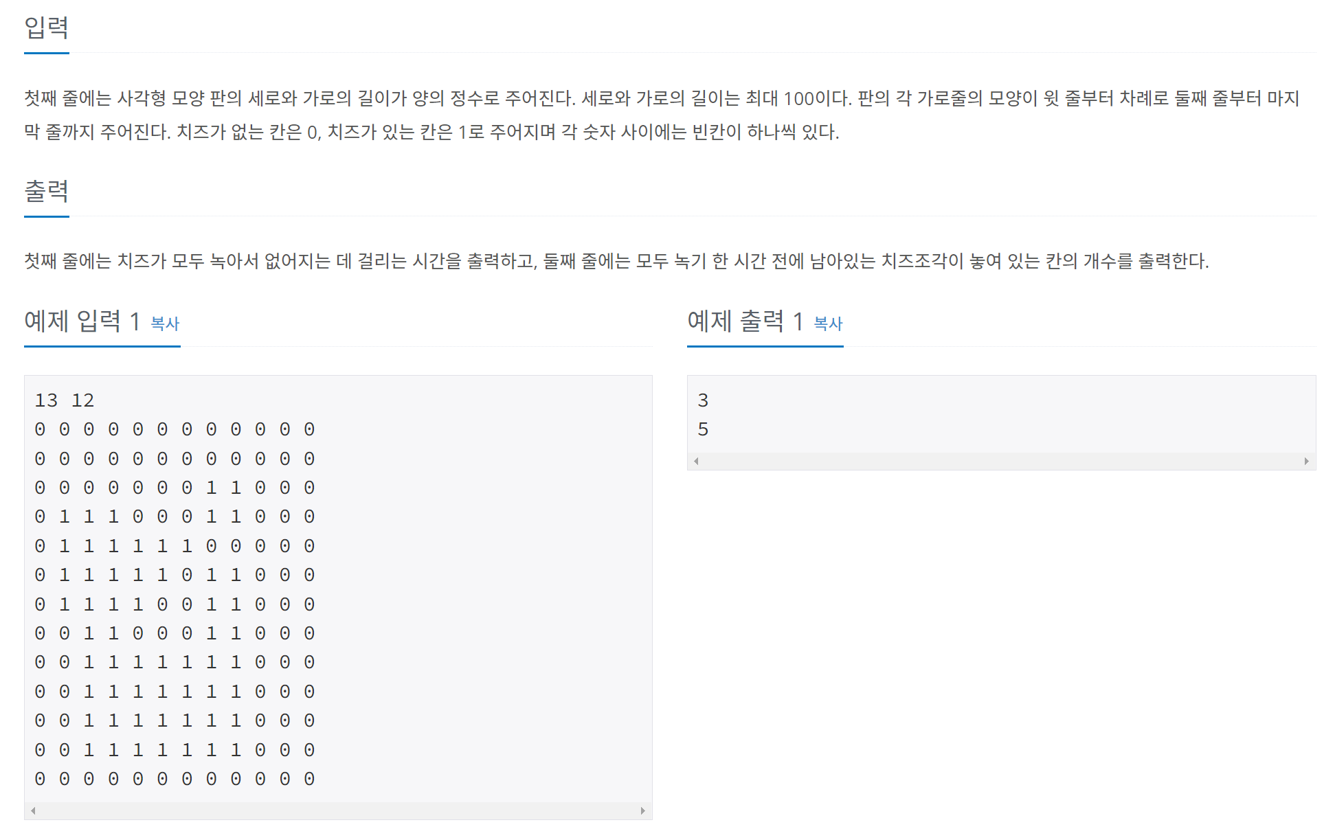 치즈가 모두 녹기까지 시간이 얼마나 걸렸는지를 배열에 저장하기 위해 기존 공기가 0, 치즈가 1의 값을 가졌던 것을 공기가 1, 치즈가 0의 값을 가지도록 배열에 저장했습니다.